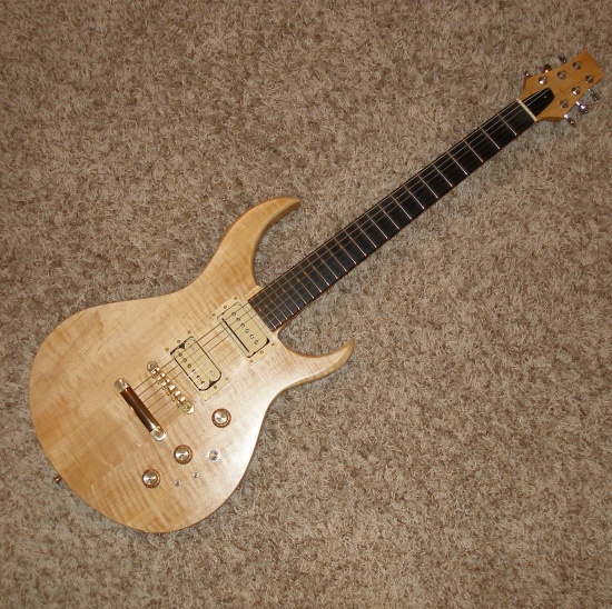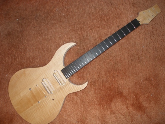 Here is the guitar after staining the top and front of the headstock. Note the fretboard, no markers visible. Again, you can also see the chambers in the middle of the pickup holes.