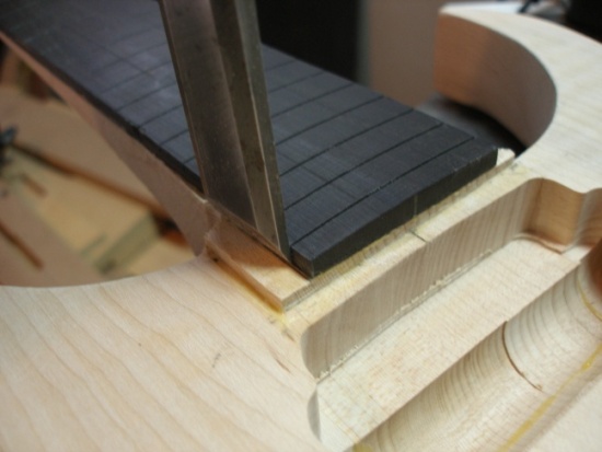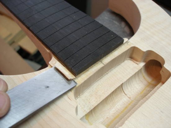 In this pic I'm removing wood on the fretboard support, around the fretboard. Just use a chisel to score the wood...