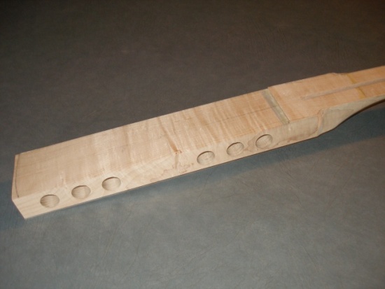 Here is the neck with the chambers drilled through. I left the wood solid in the area of the bridge/tailpiece.
