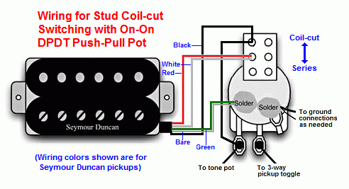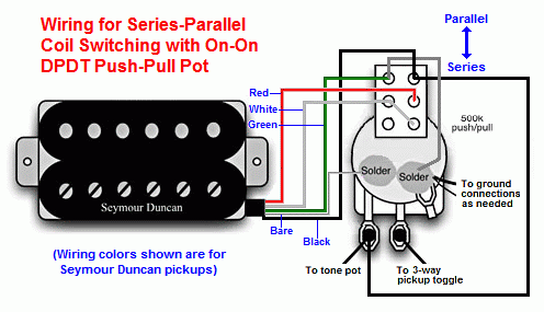 A stock humbucker is almost always wired in series. They can also be wired in parallel, which gives the guitar a different sound. It’s brighter, more like a single coil sound, but is still humbucking. The volune is a bit less, but it’s not as drastic as using a coil cut. By using a DPDT switch that is on in both positions, you can have either sound at the flip of a switch. Here is a diagram of how to wire a switch for that purpose: